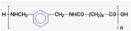 尼龍-mxd6是由三菱氣體化學公司從m-xylenediamine(mxda)生產的廣泛的聚酰胺的通用名稱。它是由間苯二甲胺mxda與己二酸的縮聚而產生的結晶聚酰胺。與尼龍6和尼龍66不同,尼龍mxd6是一種脂肪族聚酰胺,其主鏈中含有一個芳環?;瘜W結構如下: